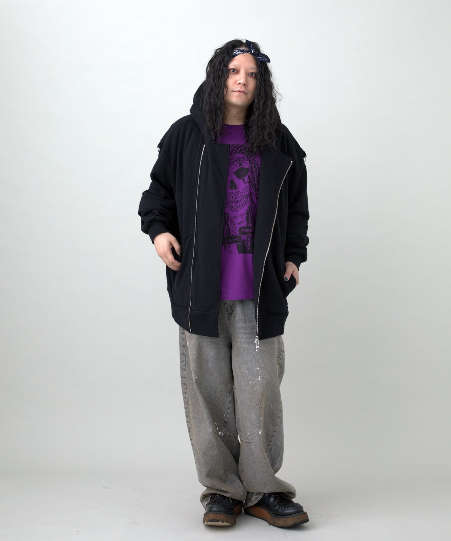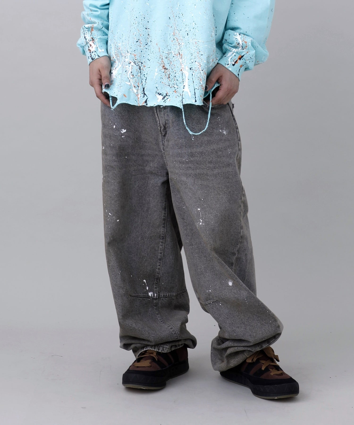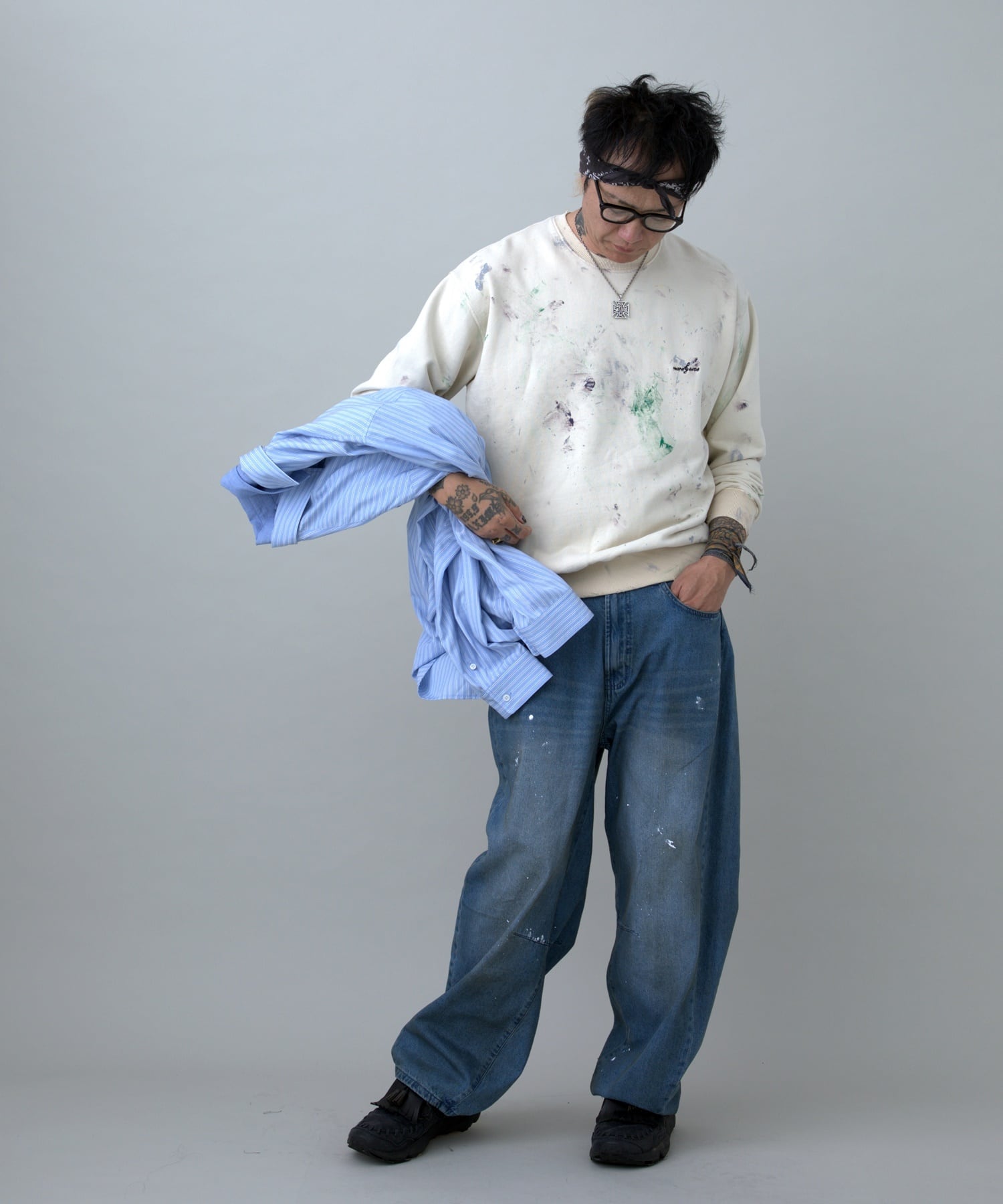 太もも辺りに余裕ある、ゆったりしたテーパードデニムパンツです。うっすら軽い表情あるくらいのペンキ加工が入ってます。