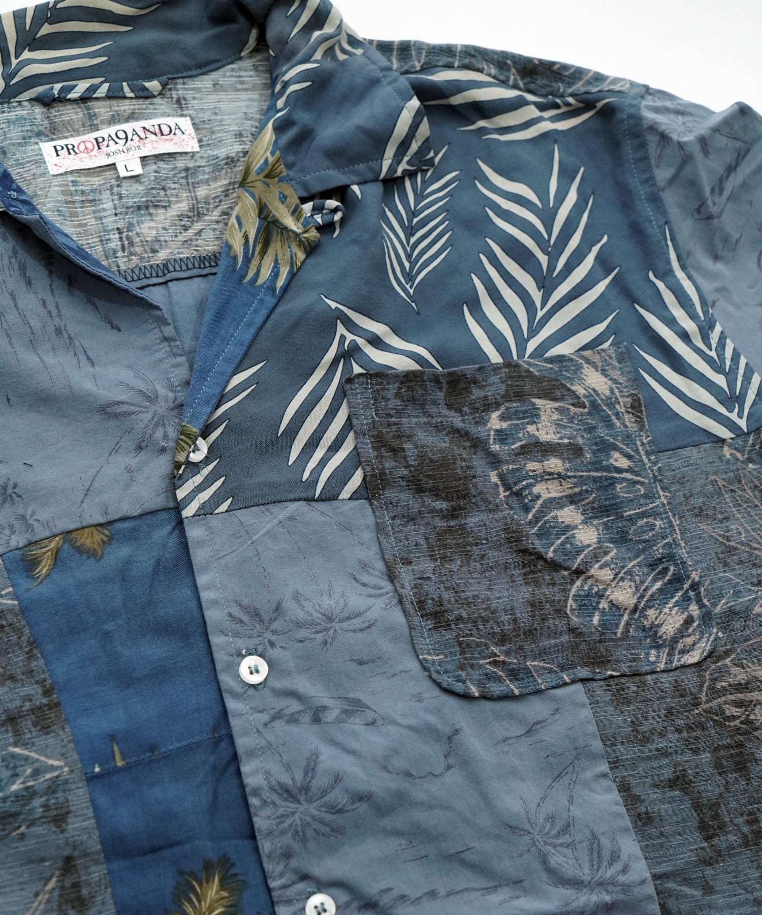 ボタニカル柄の古着アロハシャツを解体して再構築した、リメイク満載のアロハシャツです。カラーはブラック系、ネイビー系で振り分けました。元が古着なので着心地は柔らかく最高です。