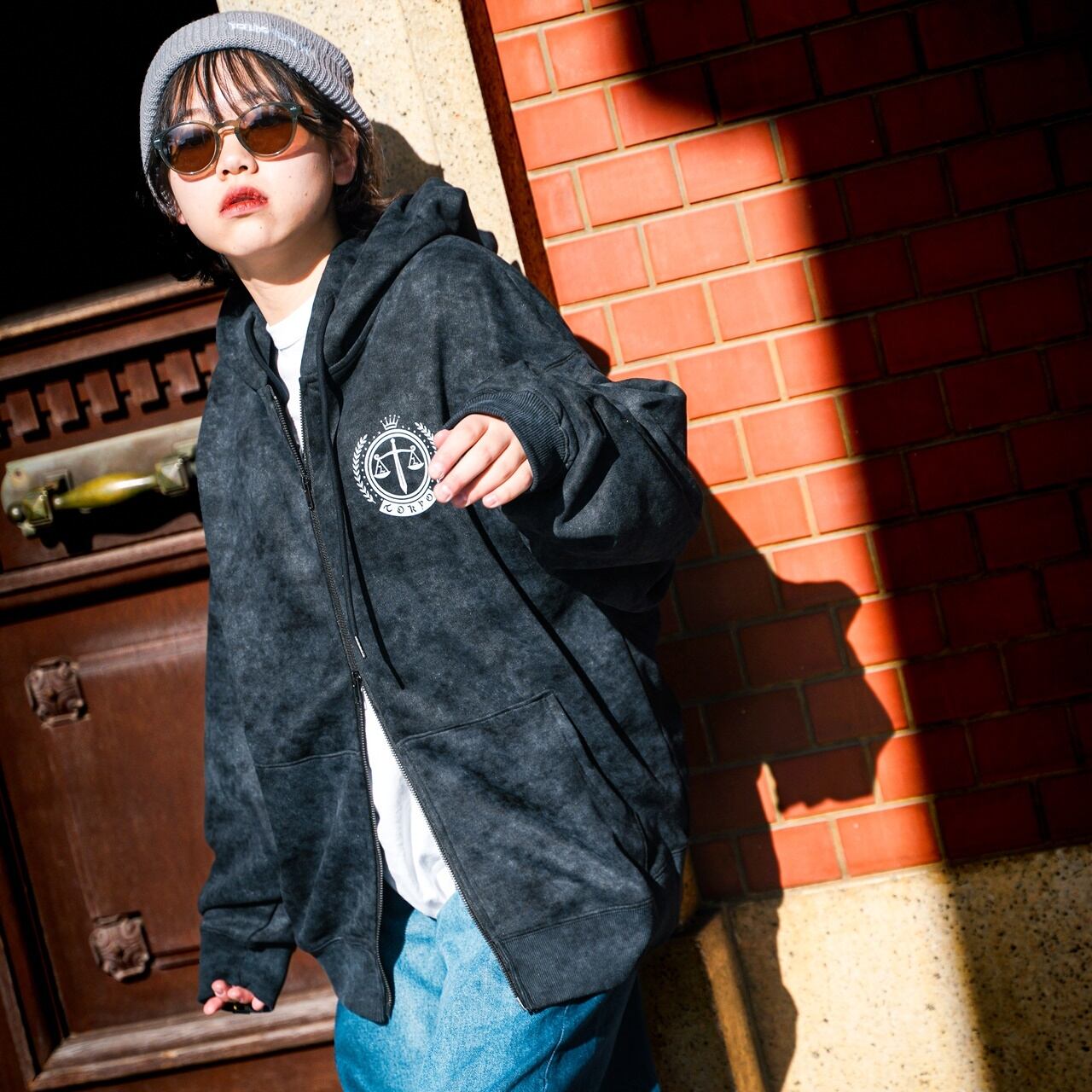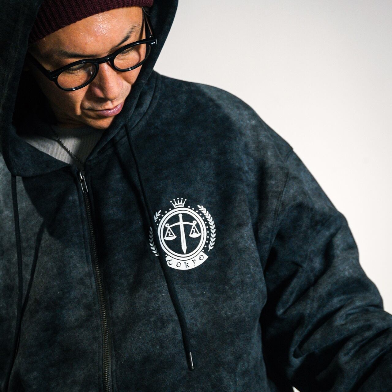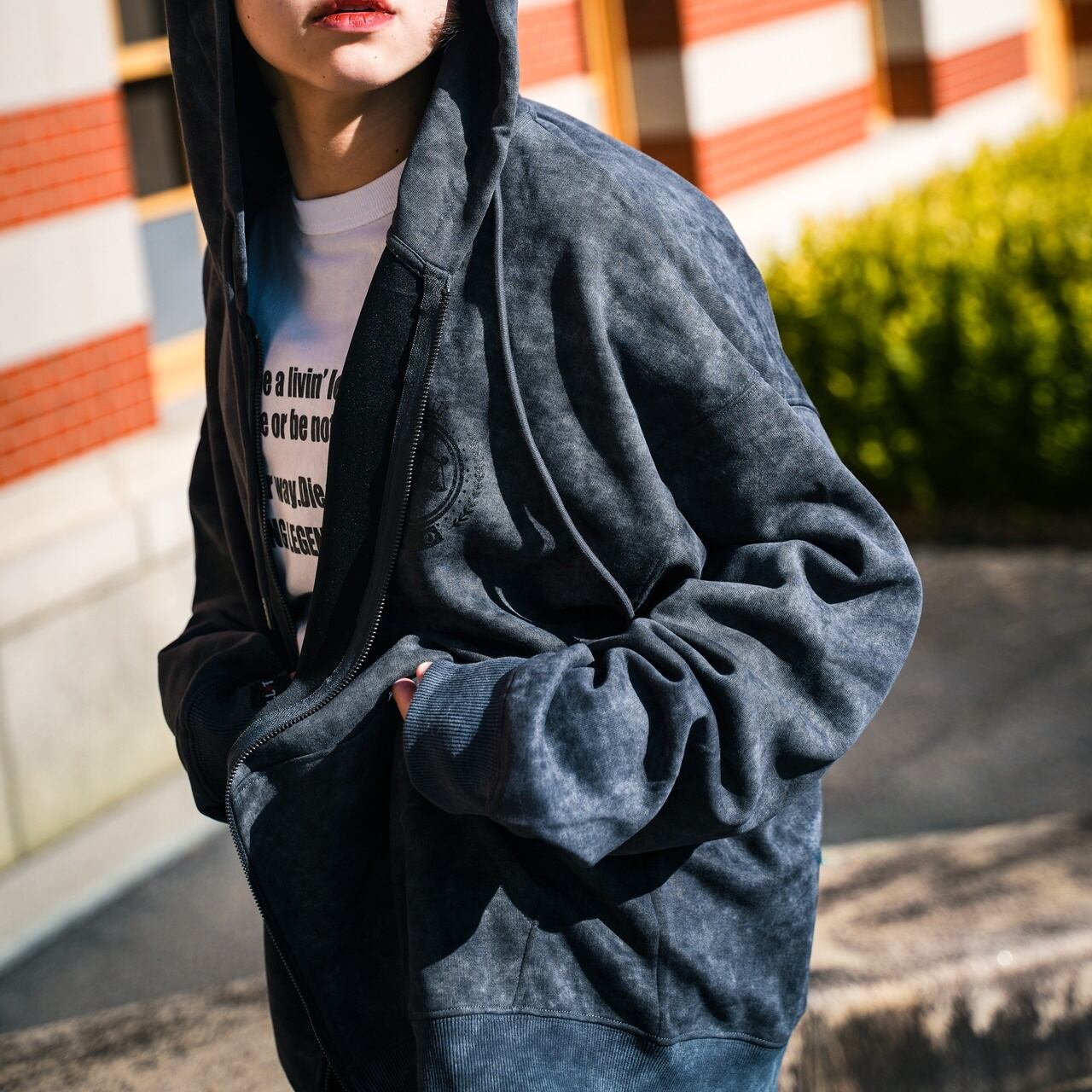 ムラ感のあるタイダイ染めが存在感を放つジップアップフーディ。