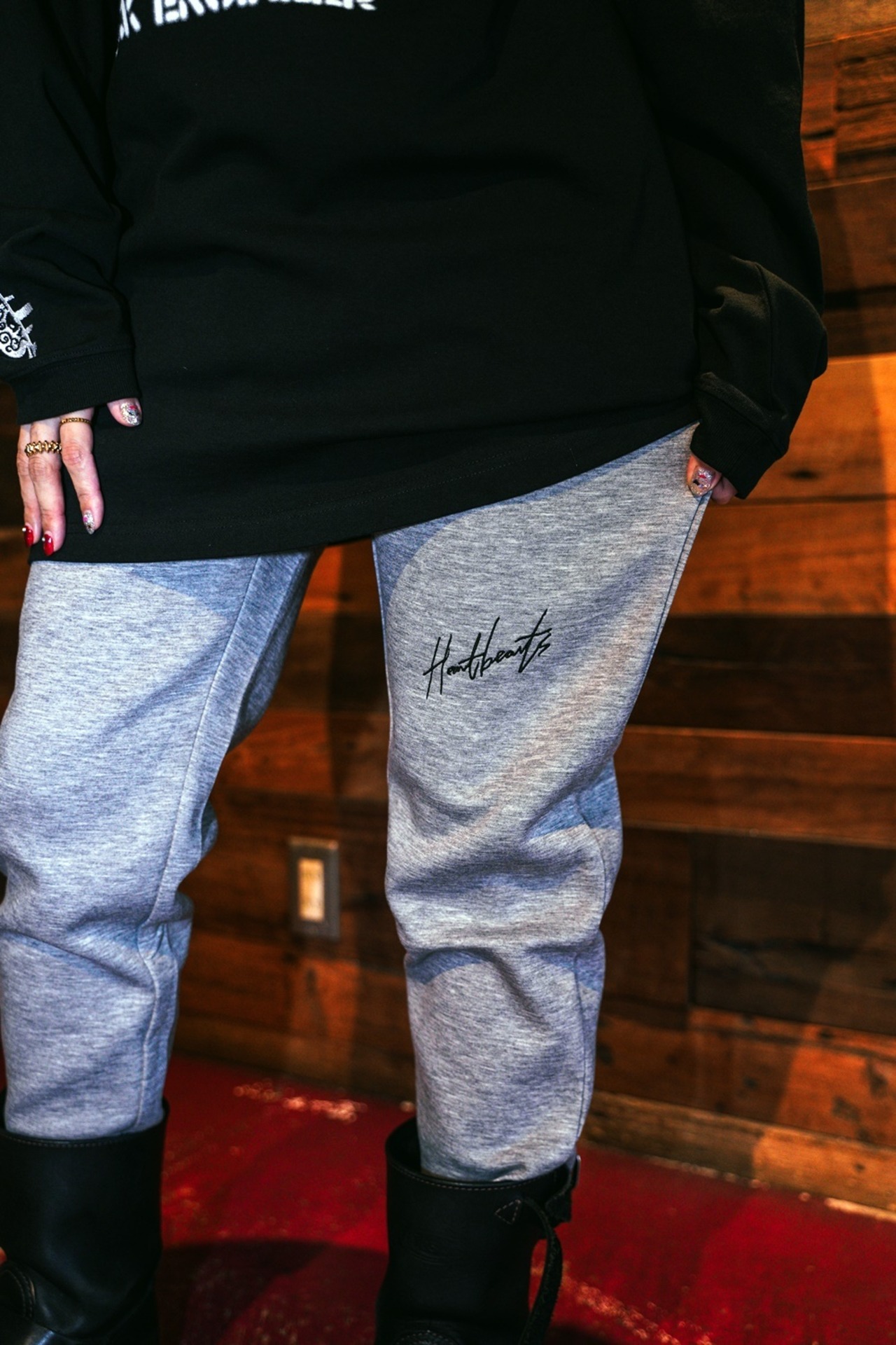 PVCレザーのベルトループや刺繍がアクセント。