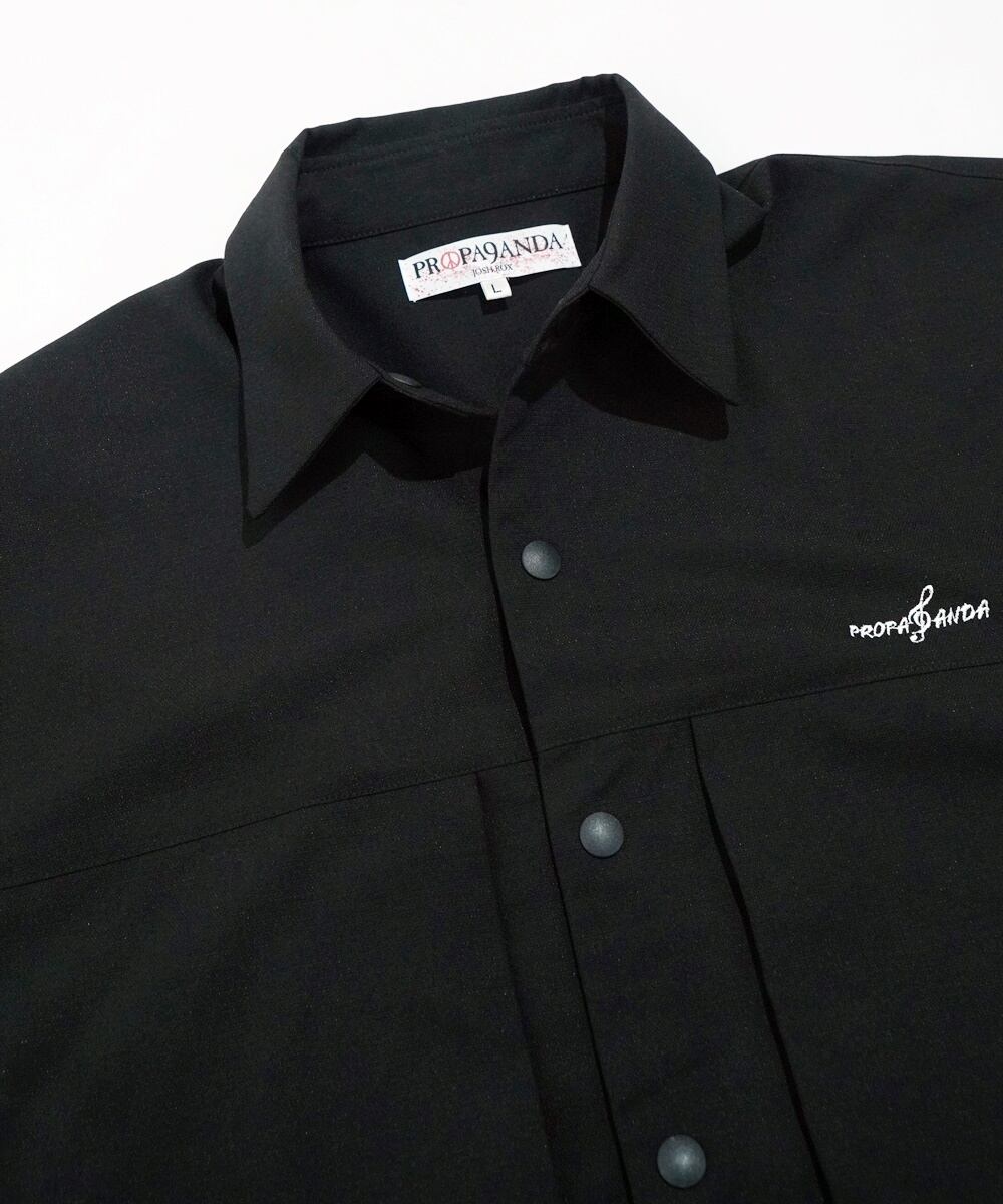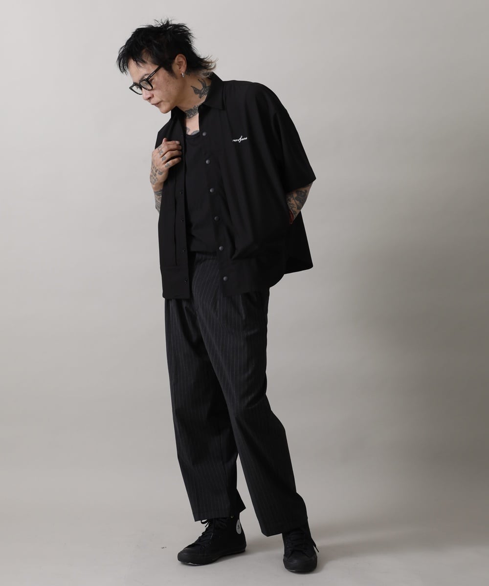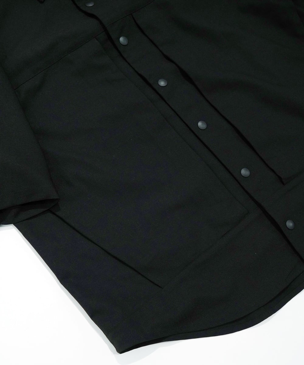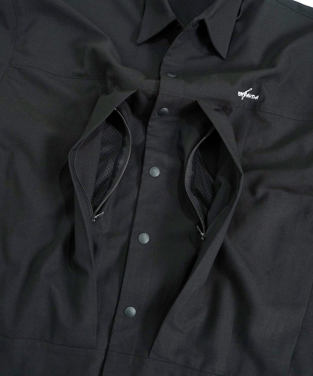 両サイドにポケット、そこに繋がるように、スナップボタン前たての腹部両サイドにもジップがあり、ギミック感も楽しい半袖シャツです。