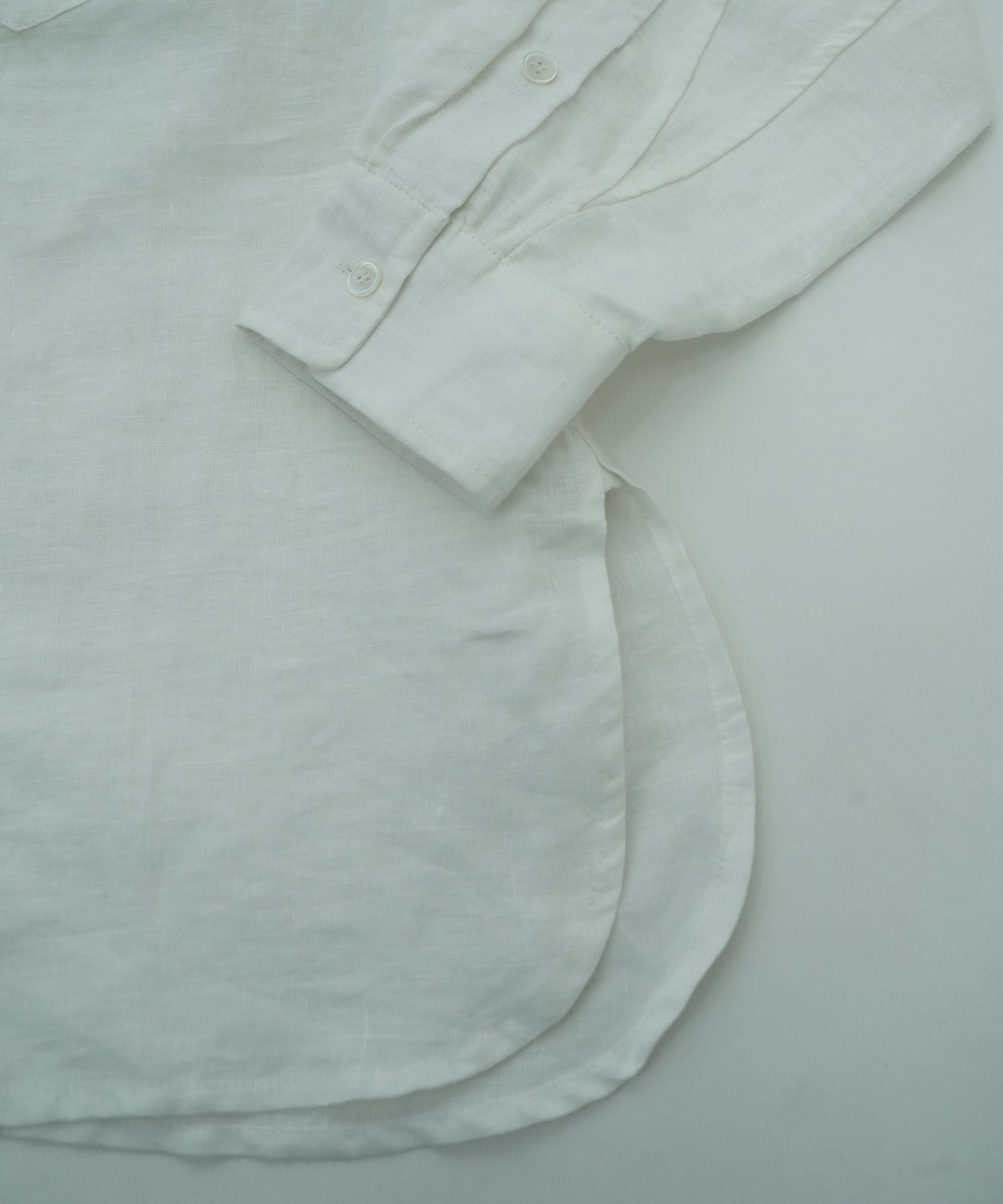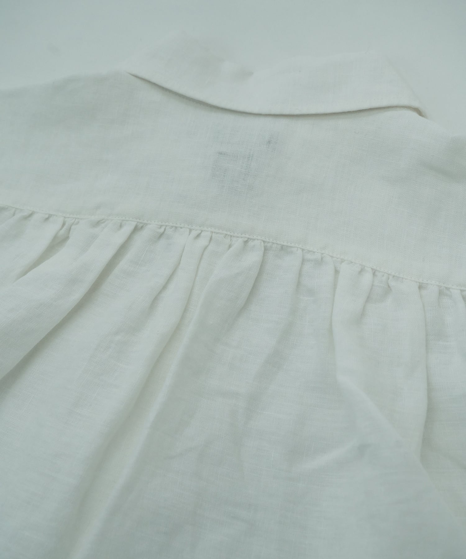 背中と袖に細かなギャザーが入った麻リネンギャザー長袖シャツです。フレンチヴィンテージも感じられるお洒落なシルエット。