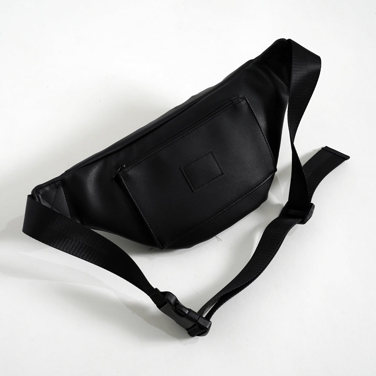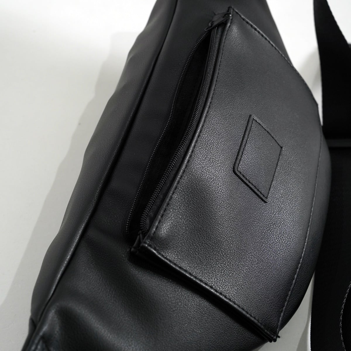 ロゴプリントのパッチと、未完の境地を意味するUNFINISHEDのパッチを縫い合わせた、合皮ベルトバッグ(ウェストポーチ)です。
